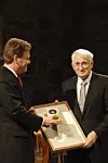 Professor Jürgen Habermas (t.h.) ble tildelt Holbergs internasjonale minnepris i 2005. Utdelingen skjedde i Haakonshallen i Bergen og overrekkelsen ble foretatt av daværende kunnskapsminister Øystein Djupedal (t.v).(Foto: Marit Hommedal / NTB)